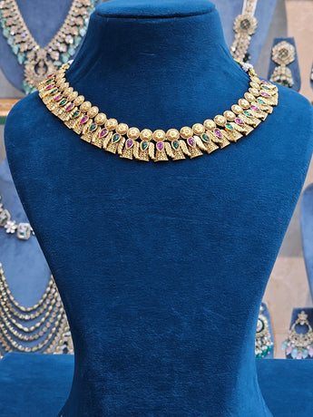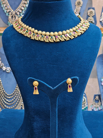 Elevate your outfit with our Antique Necklace Set! Featuring a stunning pearl drop and traditional design, this set is the perfect addition to your festive collection. With its elegant gold polish, it exudes timeless charm. Complete the look with our matching earrings.