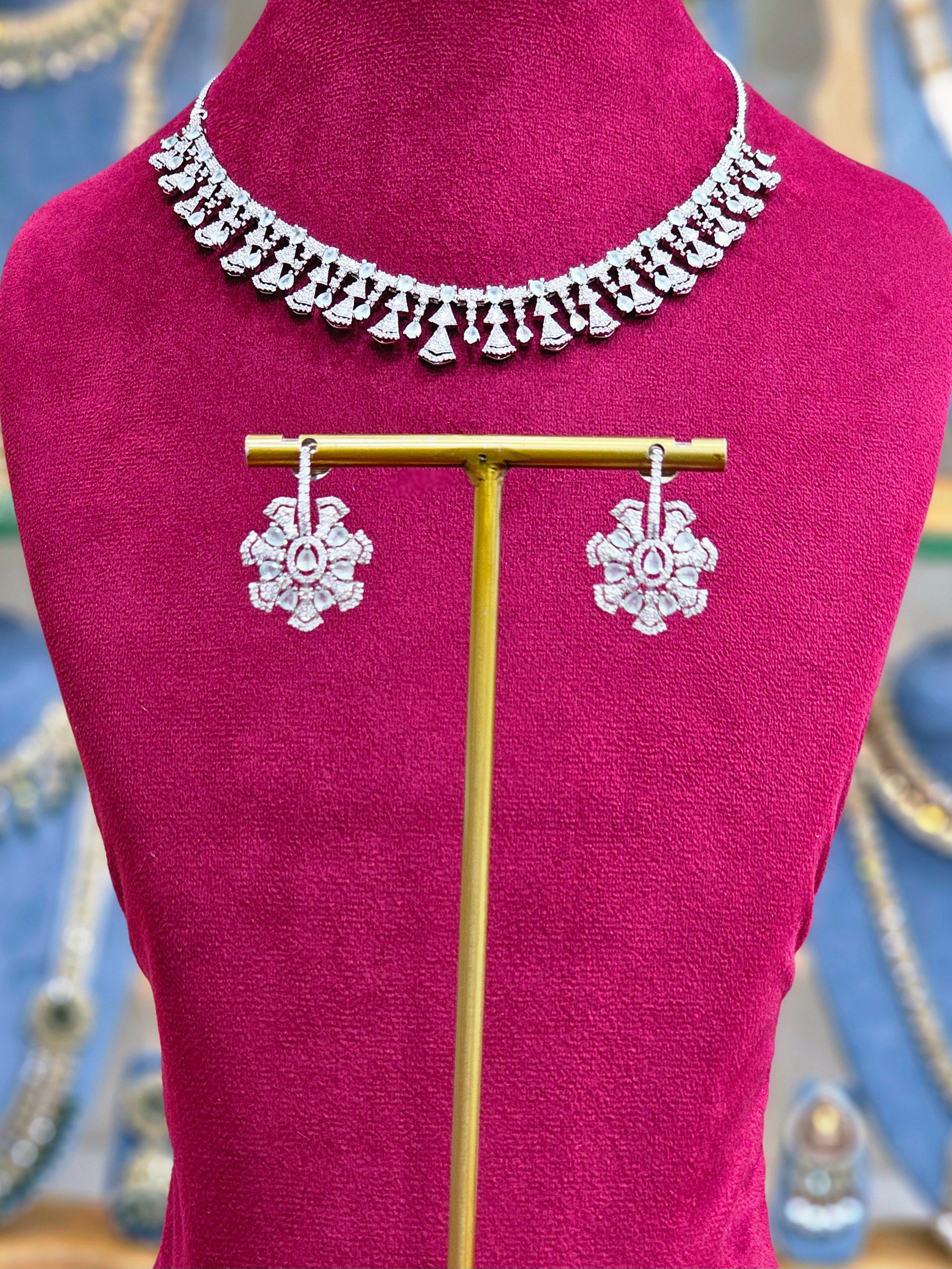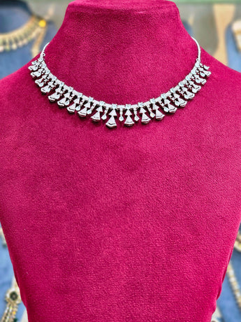 Elevate your style with our stunning Diamond Necklace Set! This set features dazzling diamonds and a sleek silver polish, adding a touch of elegance to any outfit. Make a statement and turn heads with this must-have accessory.
