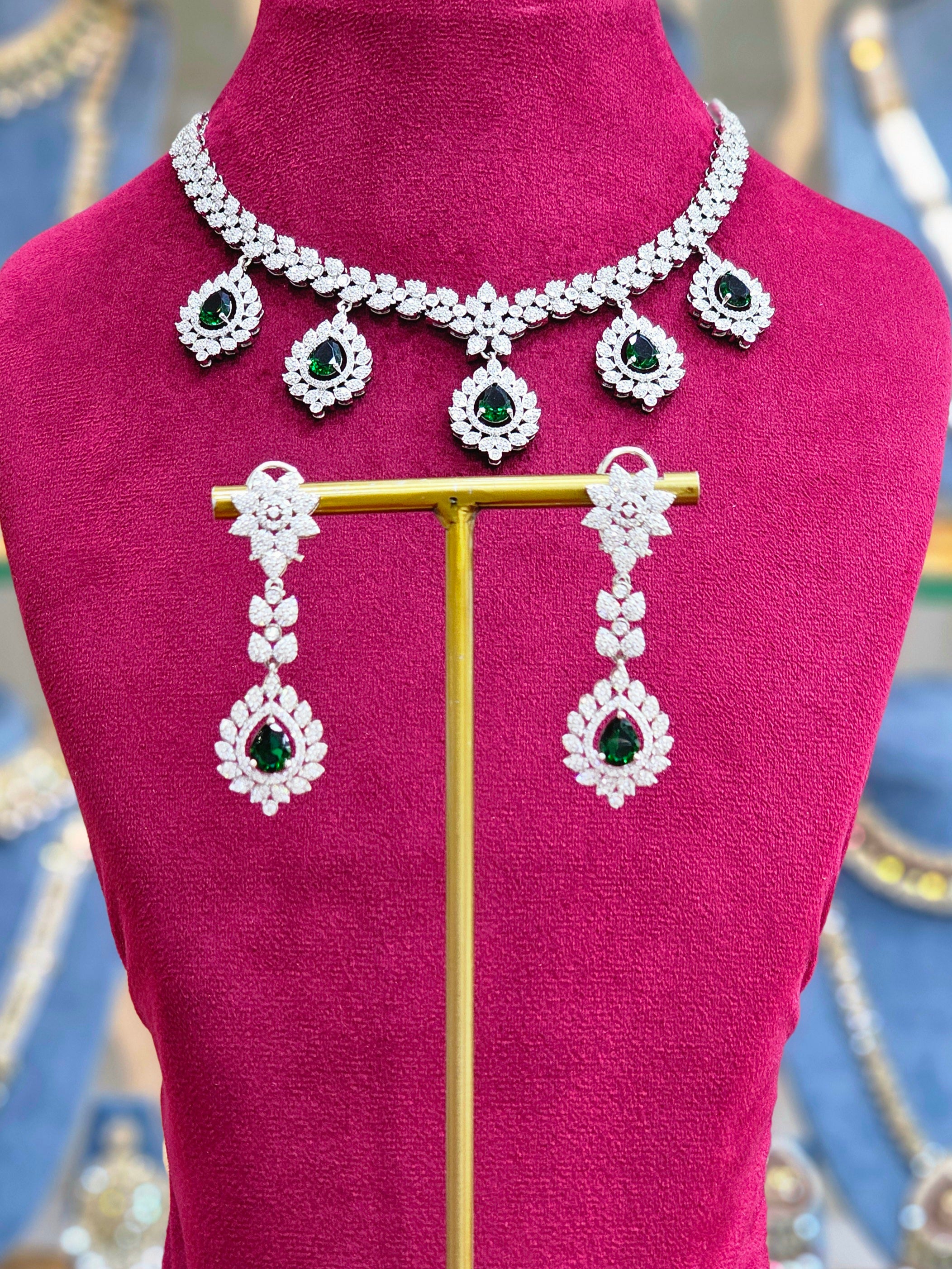 Indulge in luxury with our exquisite Diamond Necklace Set. Dazzling green diamonds are elegantly set in this stunning piece, providing a timeless and eye-catching accessory to elevate any outfit. Treat yourself or a loved one to the ultimate gift of style and sophistication.