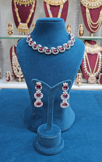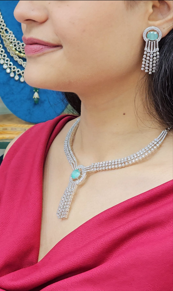 This stunning Diamond Necklace Set is sure to make a statement. The sparkling diamonds and elegant silver polish add a touch of luxury to any outfit. Complete the look with the matching earrings. Elevate your style and shine bright with this must-have set!